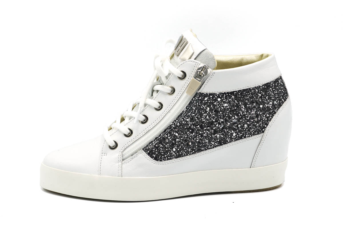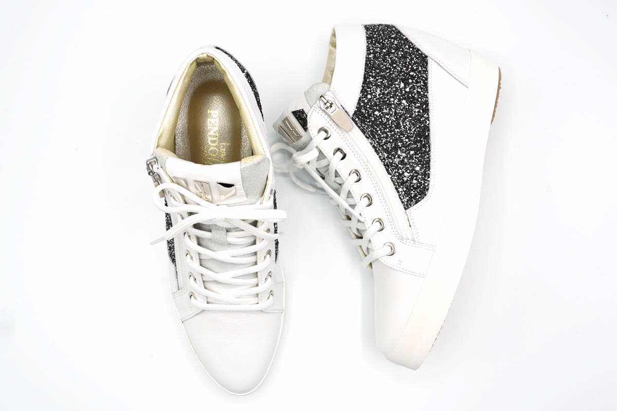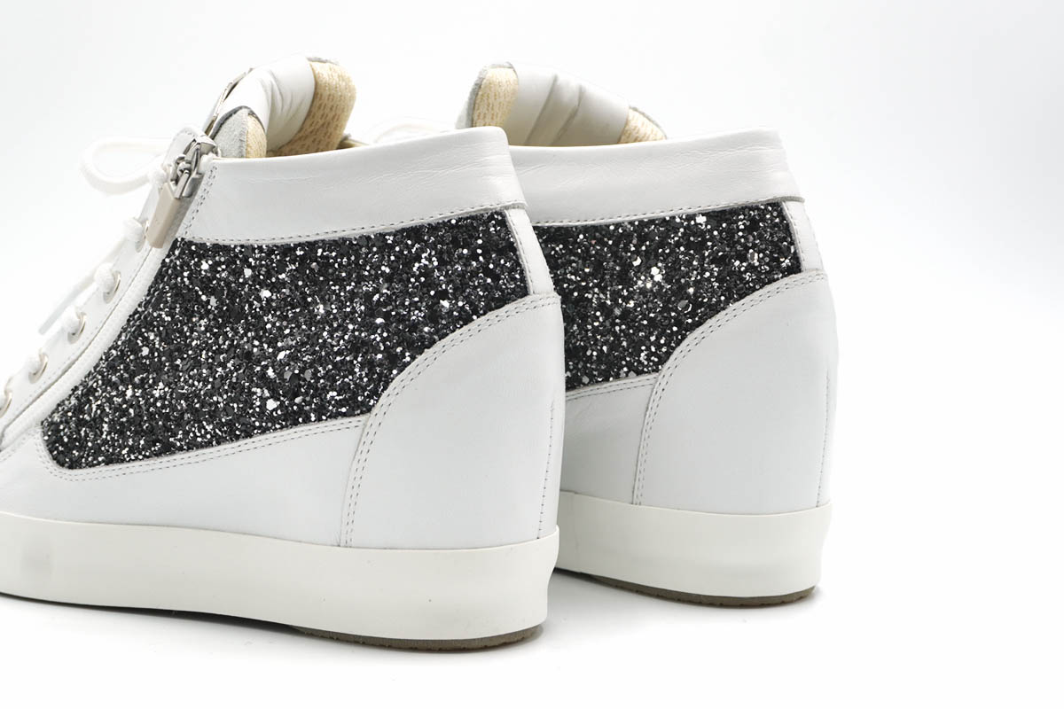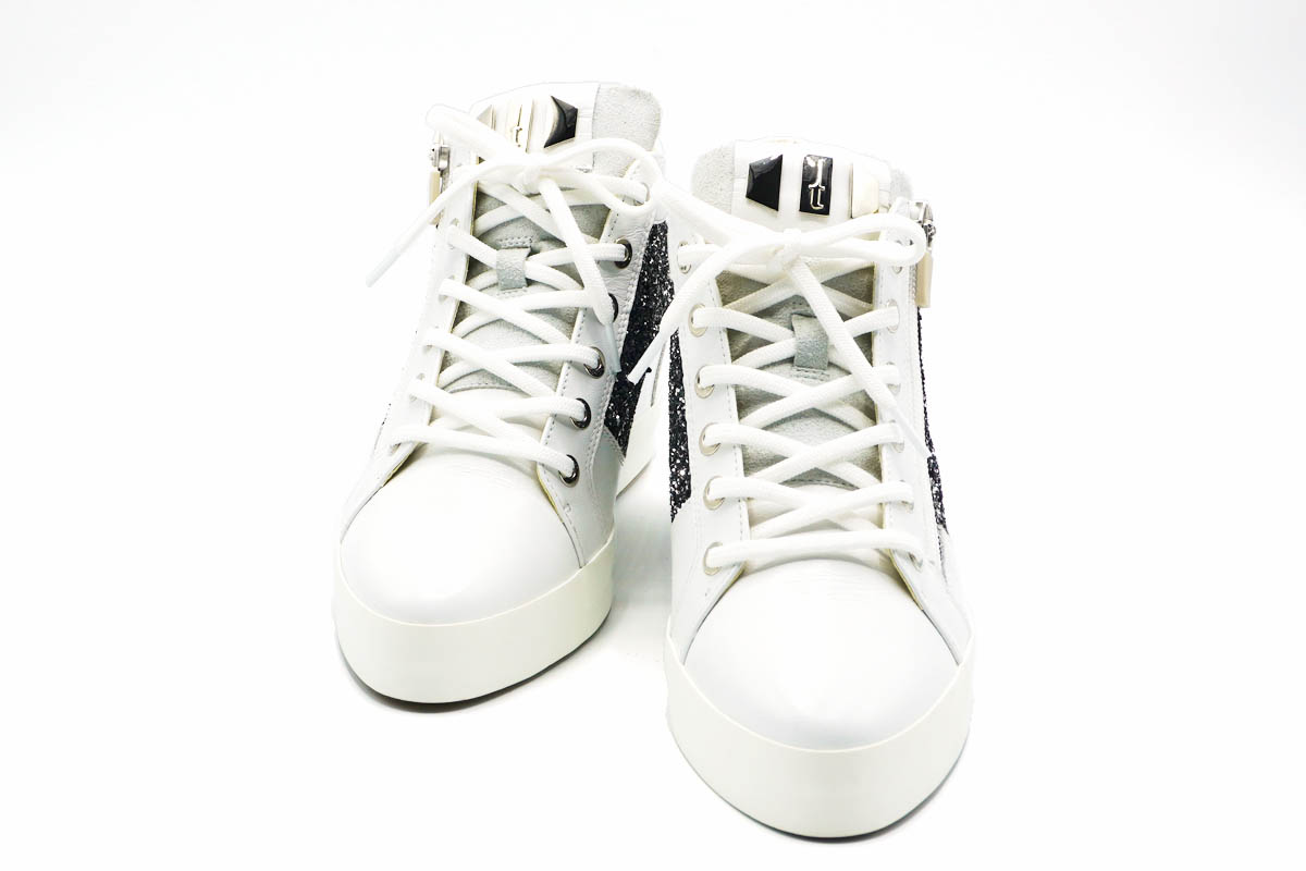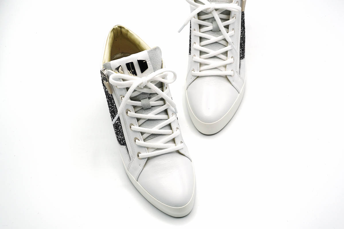 白のレザーに良く映えるイタリア製グリッター素材を合わせ、華やかな雰囲気を纏います。