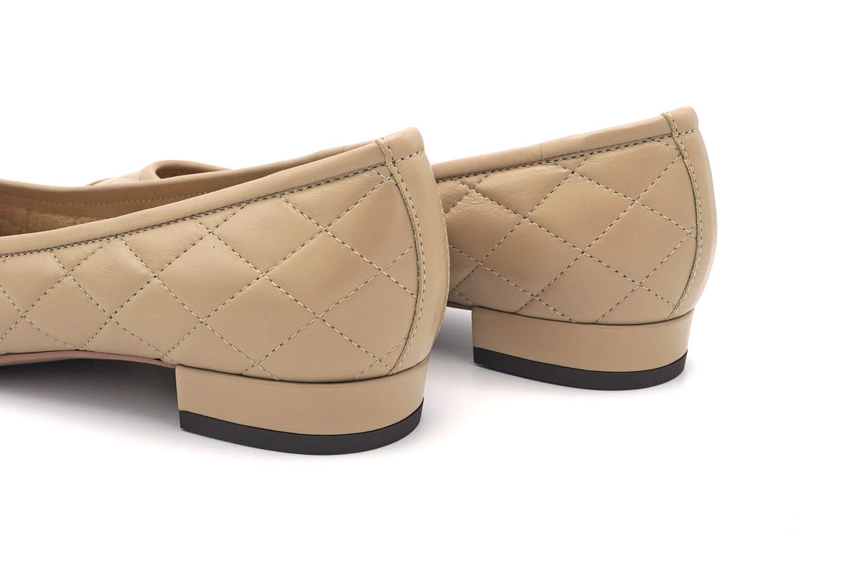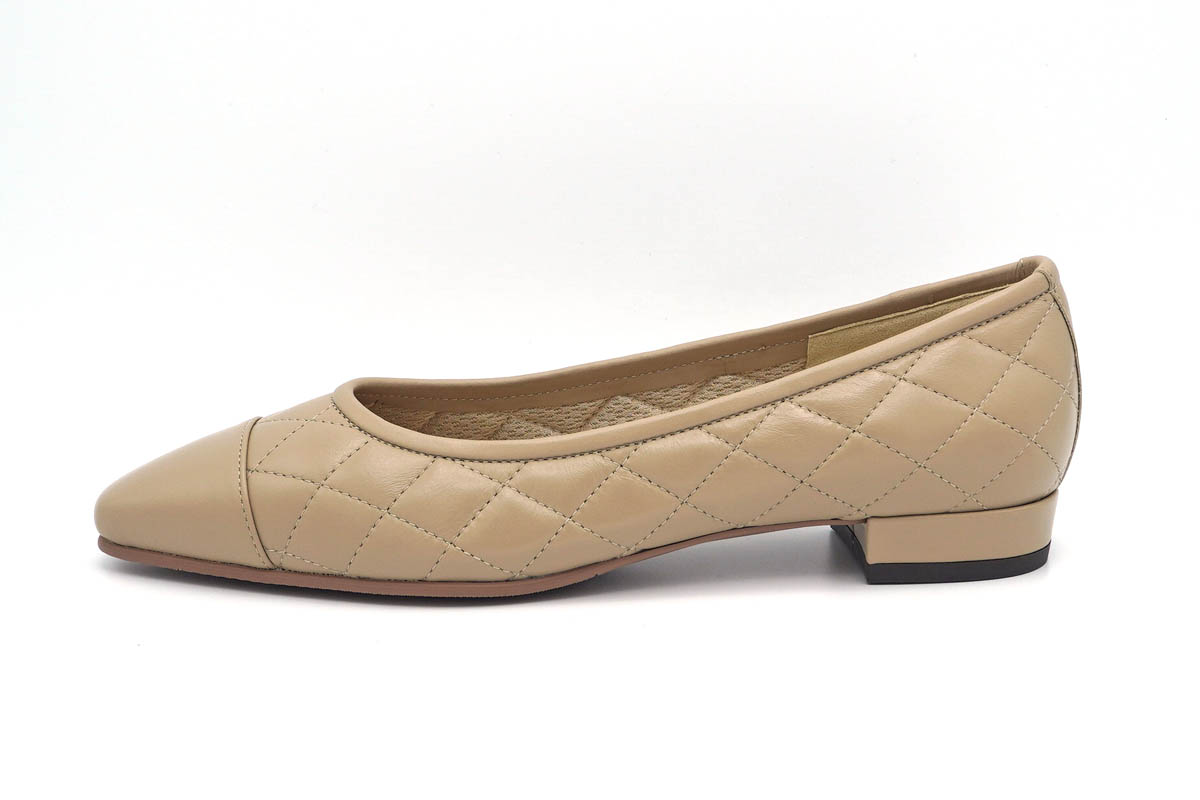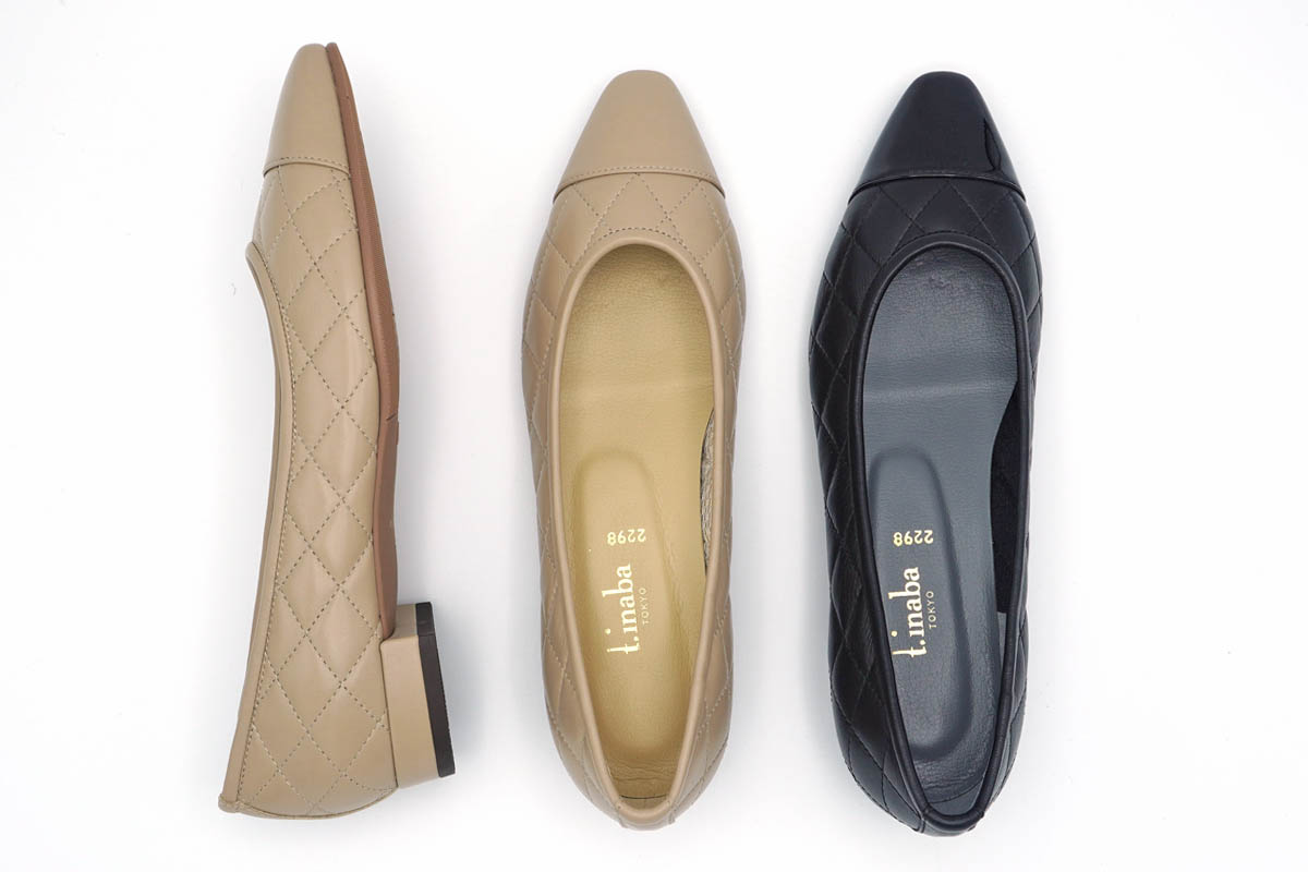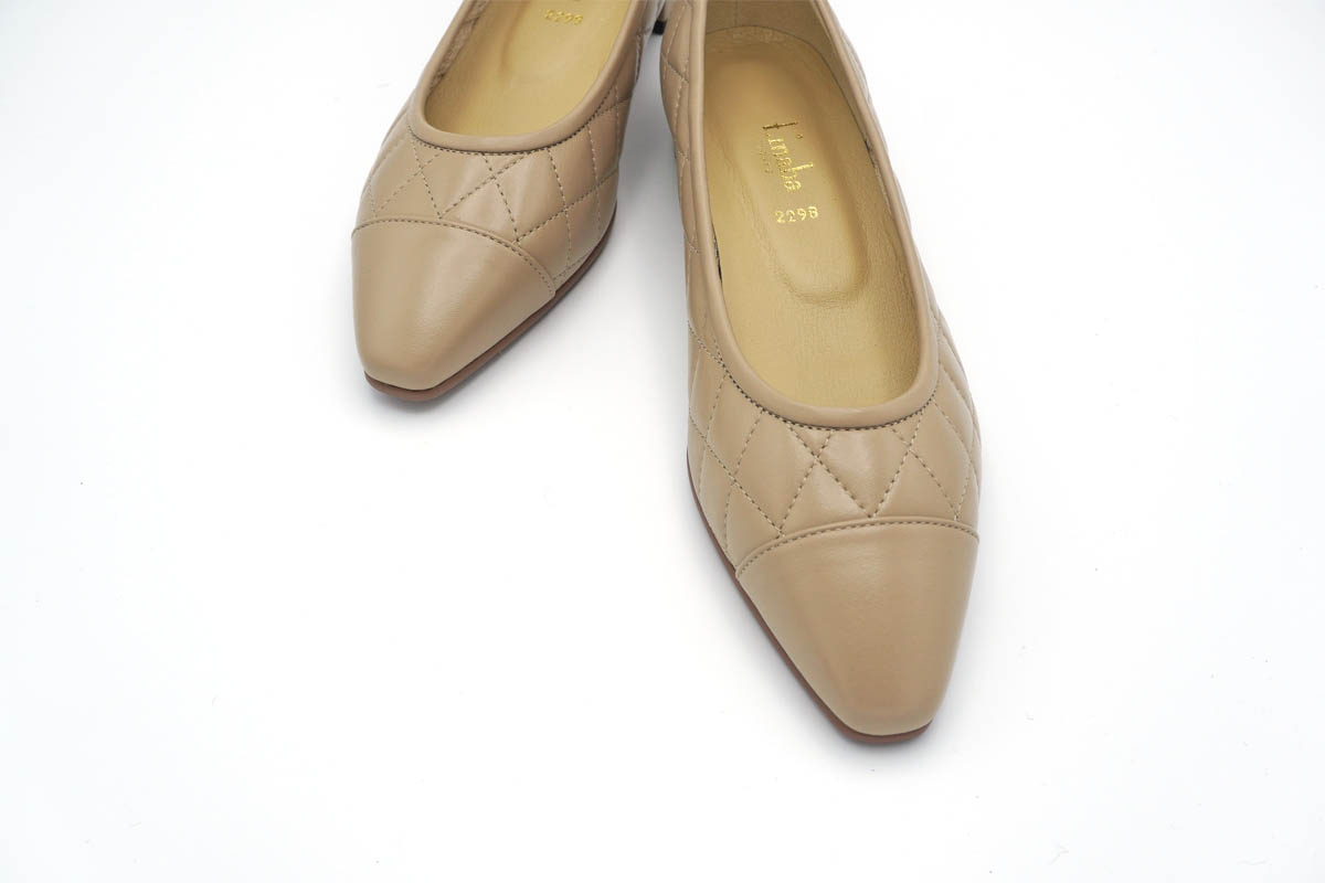 スマートなシルエットのキルティングパンプスです。