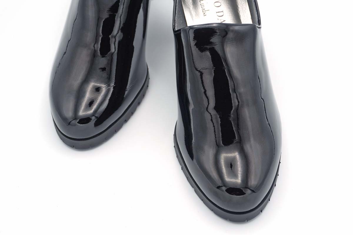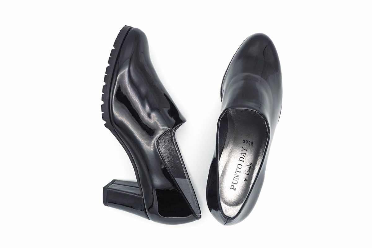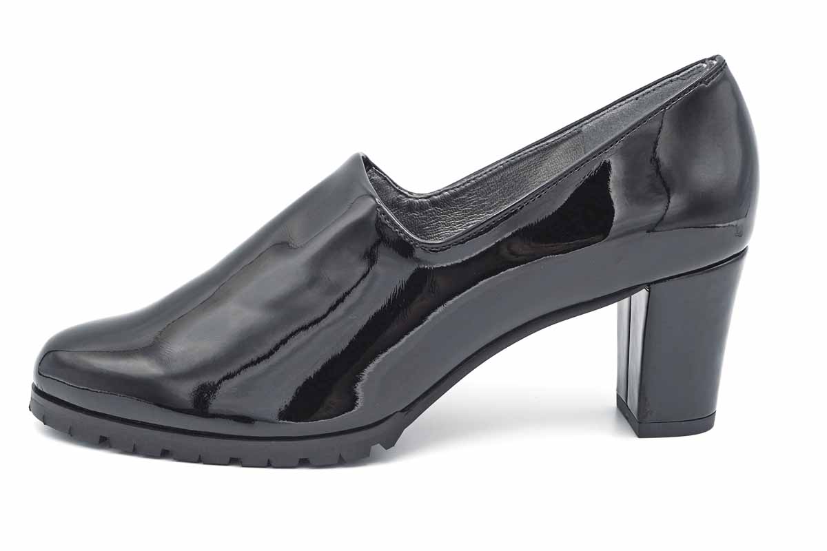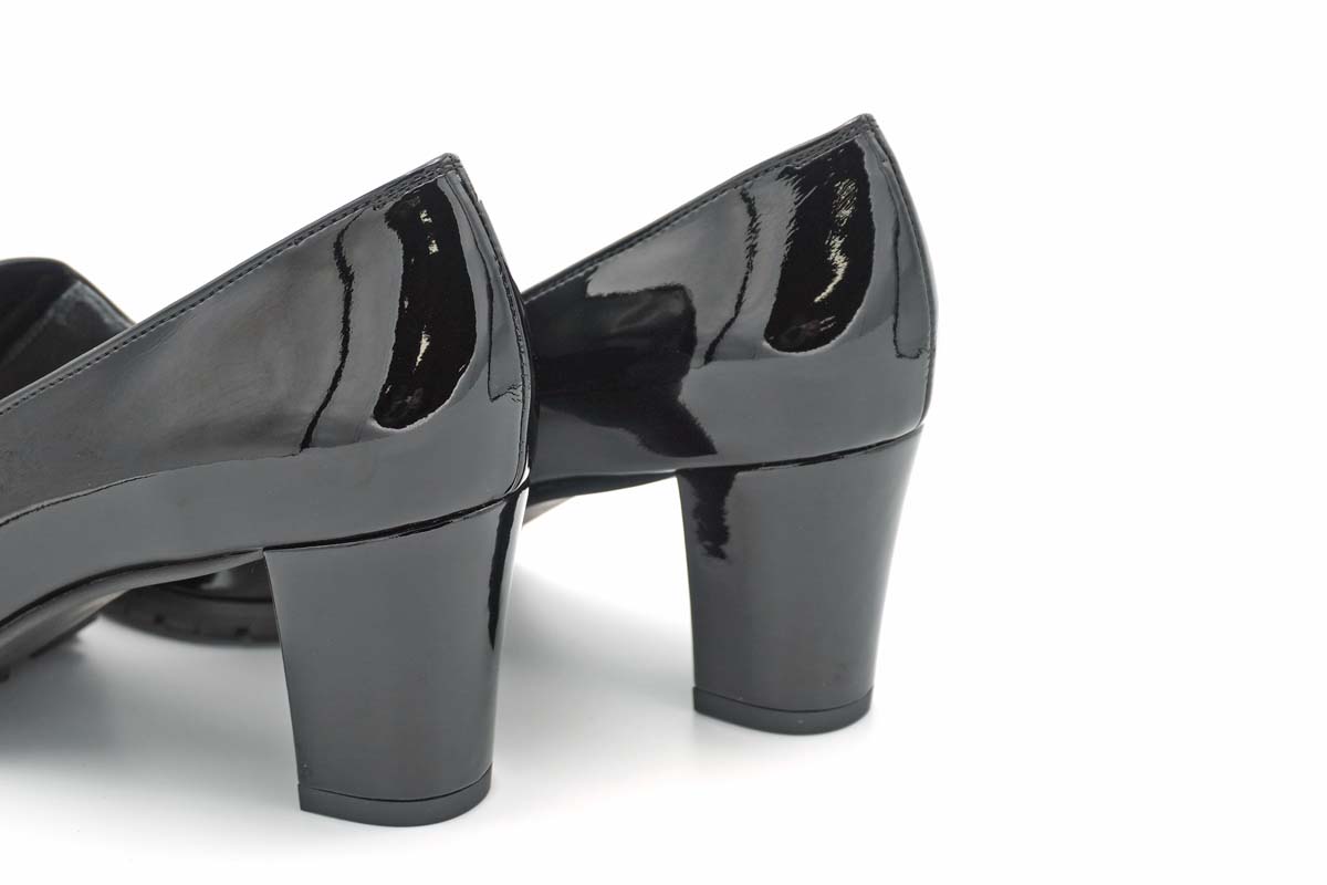 ストレッチ性に優れたエナメルを使用した、足あたりの柔らかいプレーンパンプス。