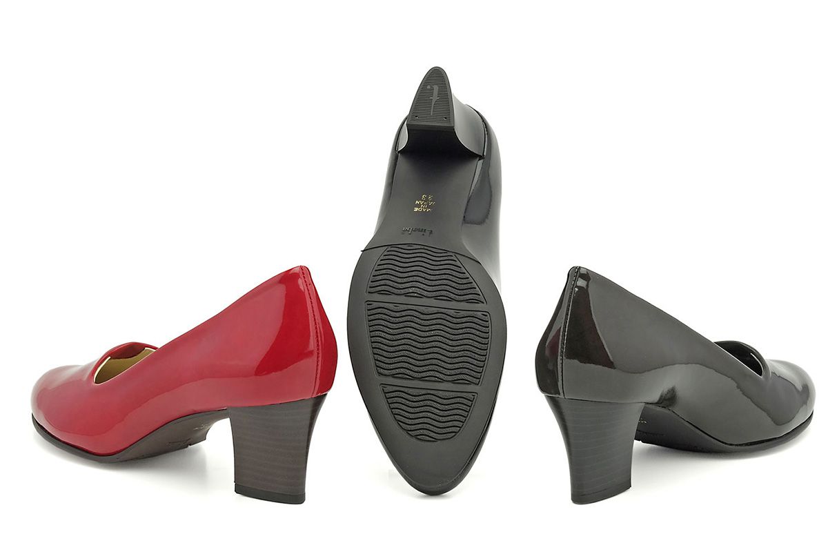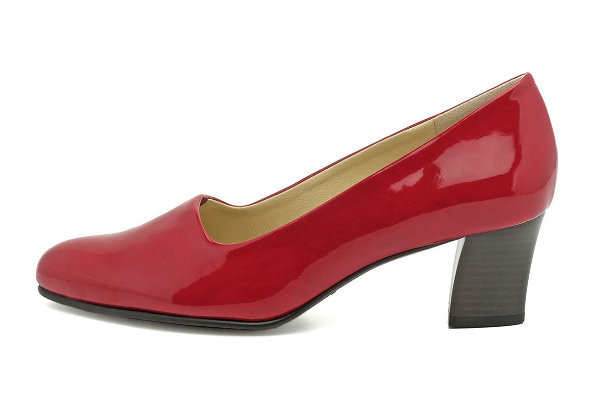 ストレッチ性に優れたエナメルを使用した、足あたりの柔らかいプレーンパンプス。