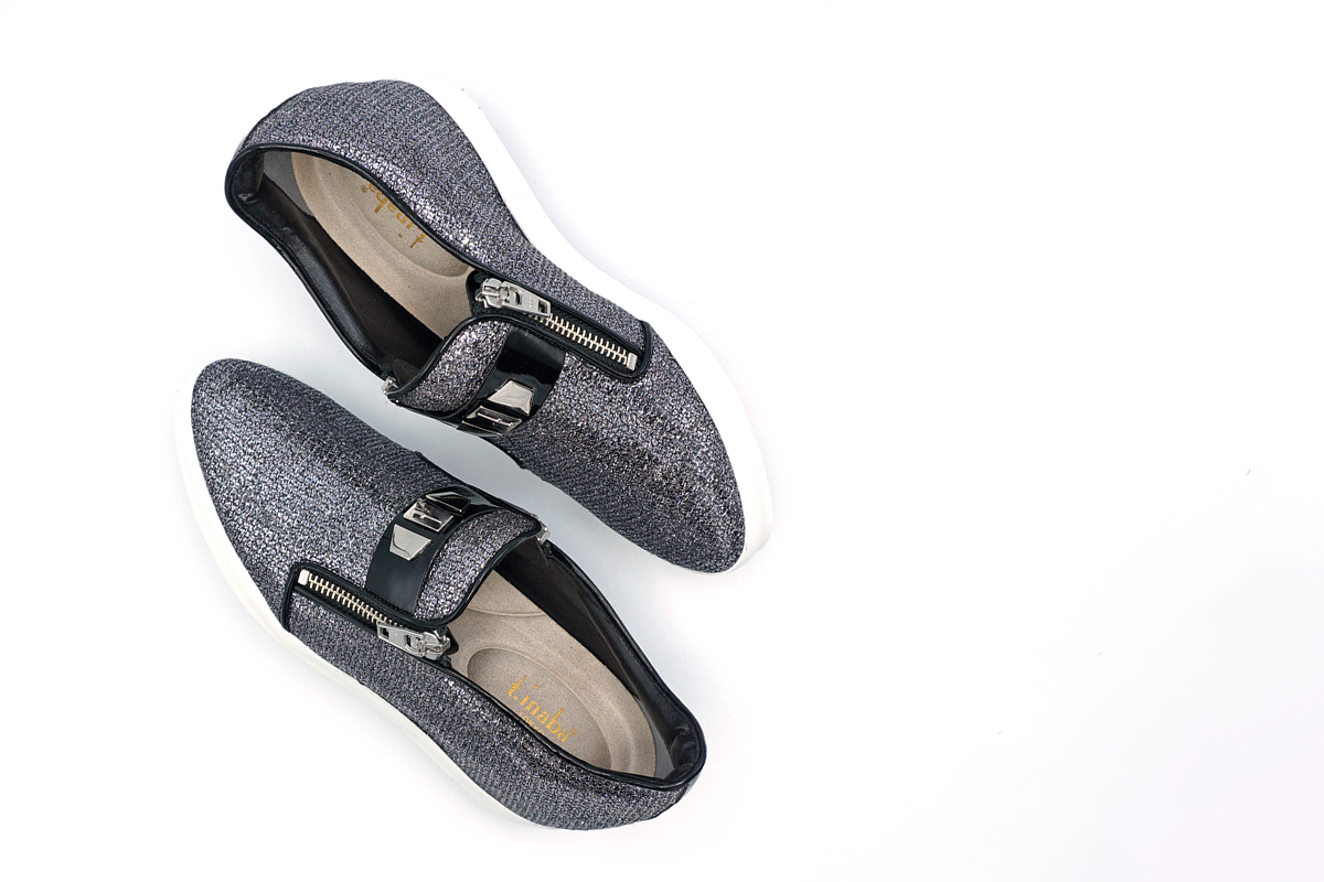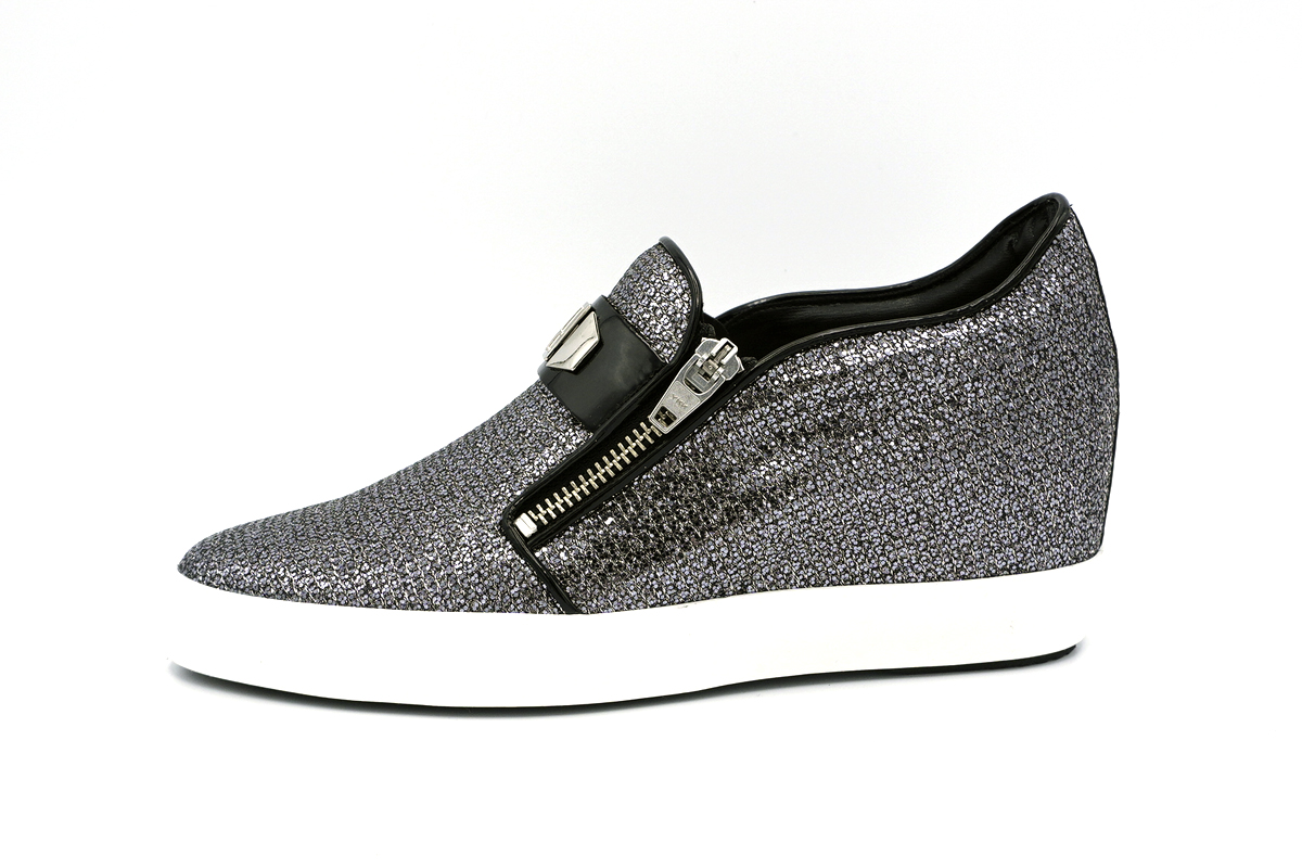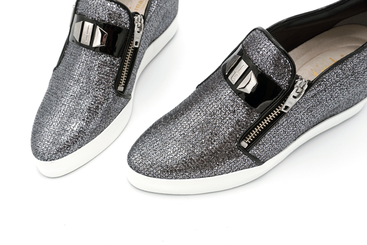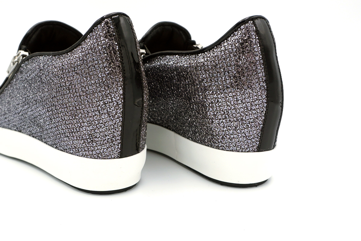 美しい輝きのイタリア製ラメ素材を用いたインヒールスタイルのカジュアルシューズです。