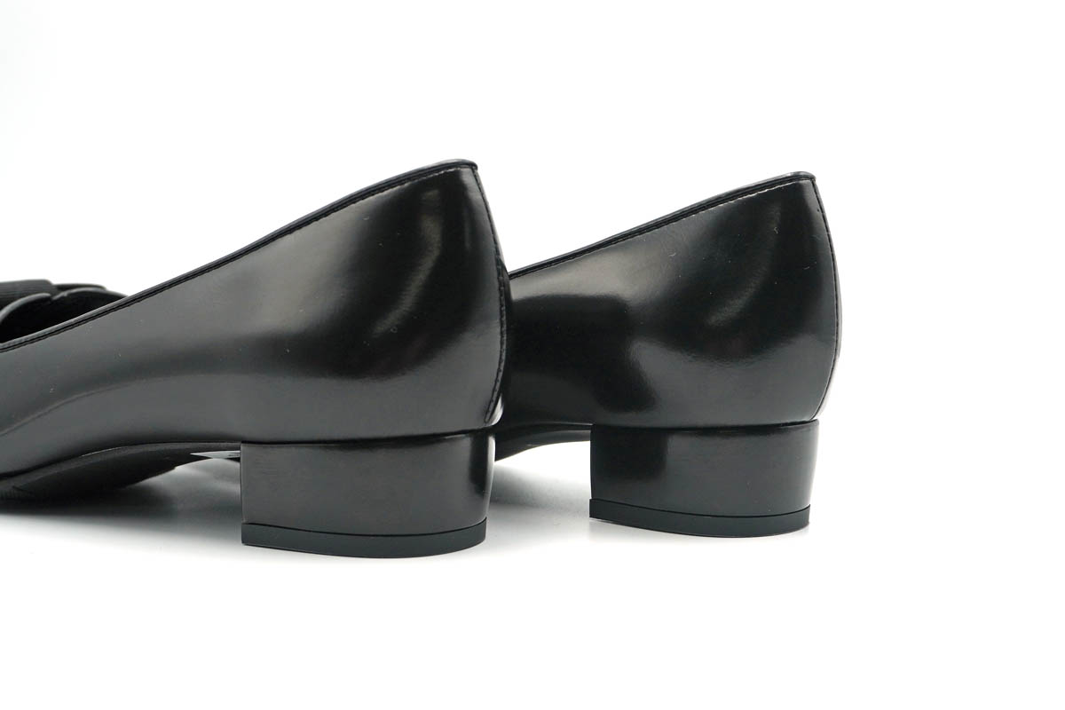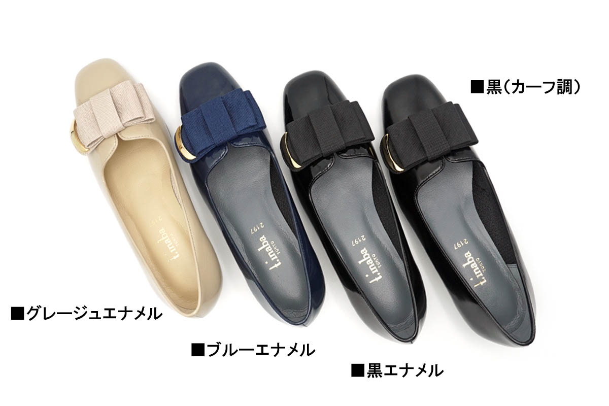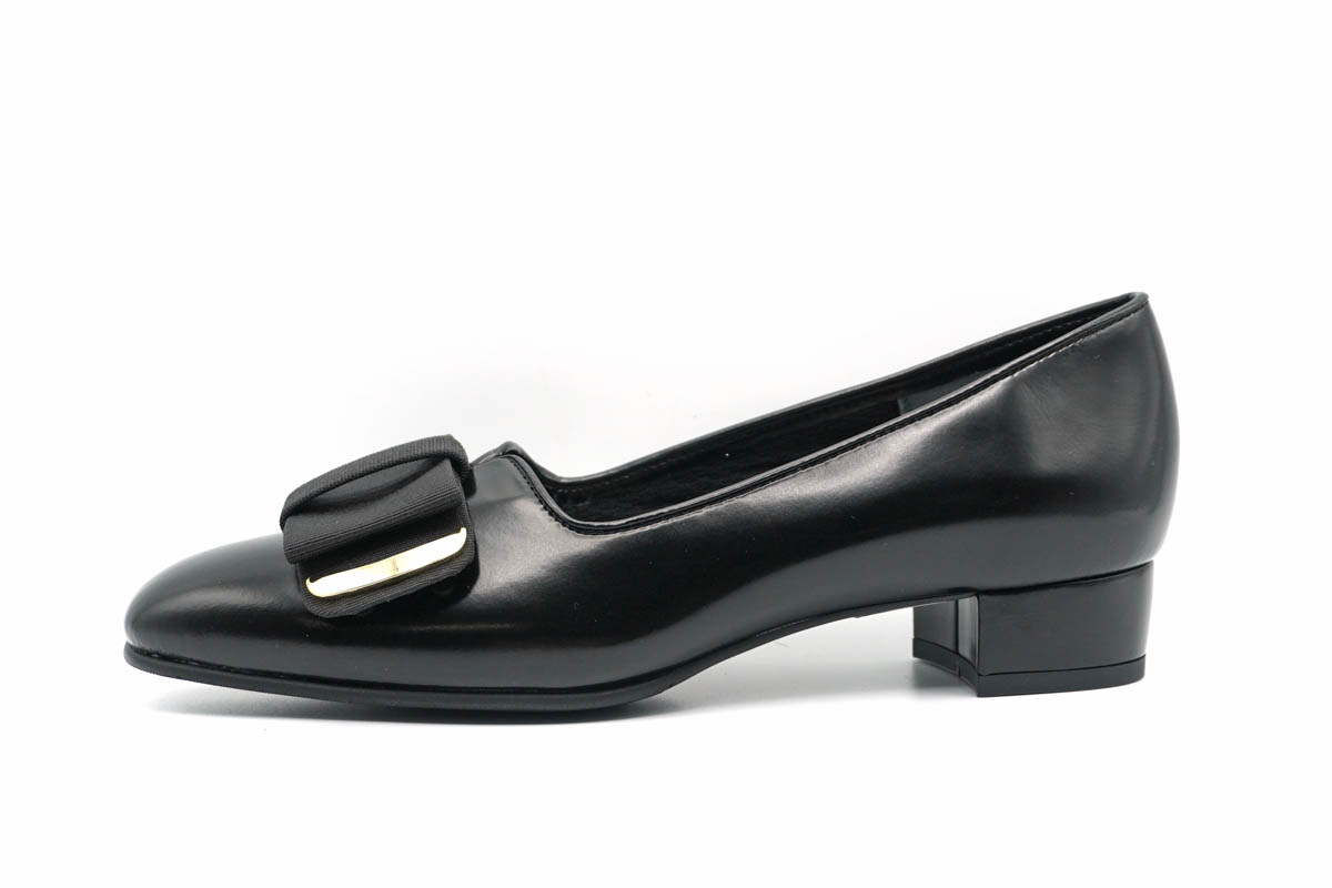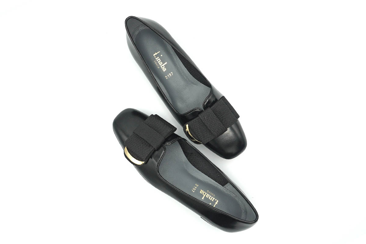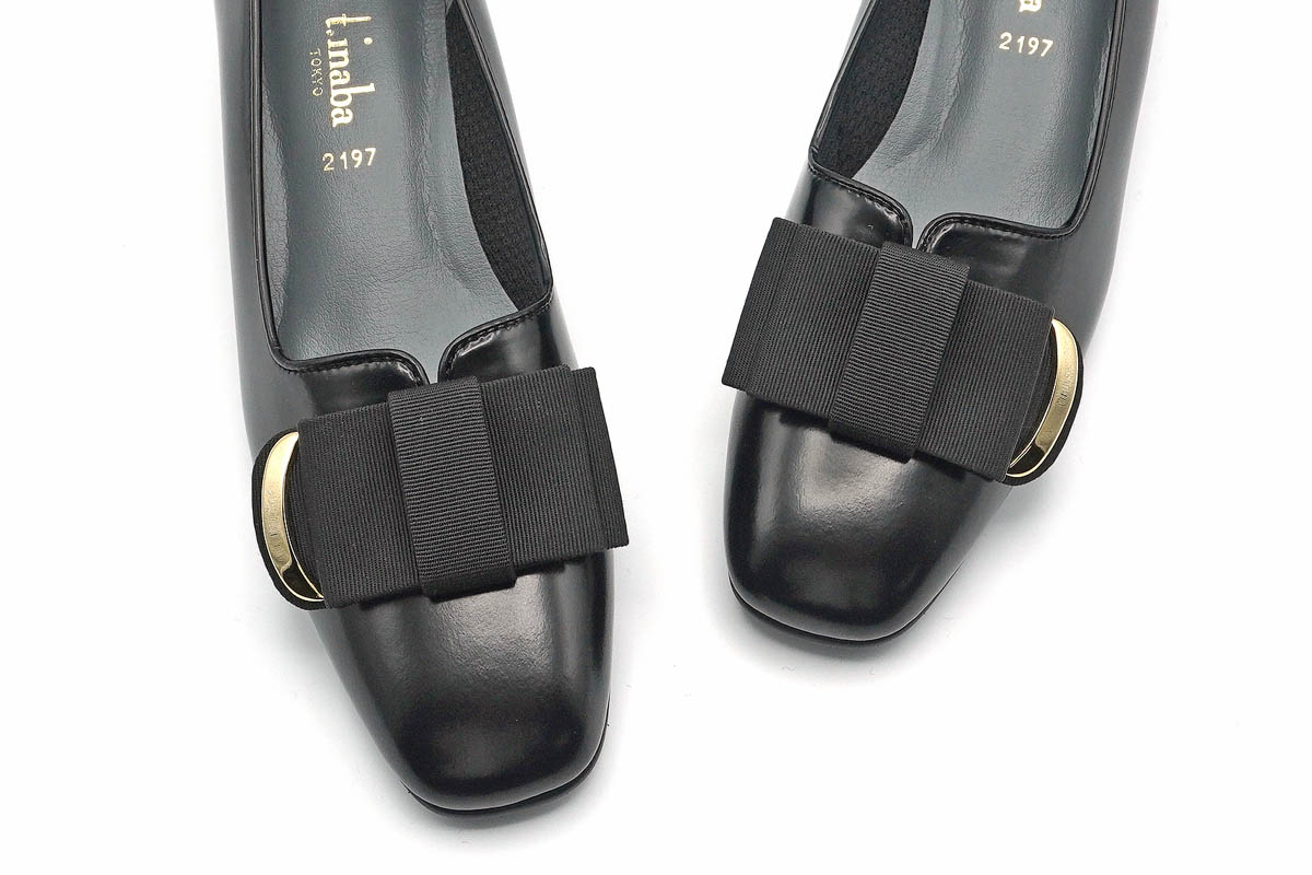 優しい丸みを帯びたスクエアトゥのリボン付きパンプスです。