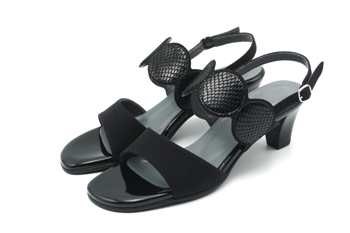 クリアな輝きのスネーク柄スウェード素材をパッチワークに、安心感ある太さのベルトでしっかりと足を抑え、