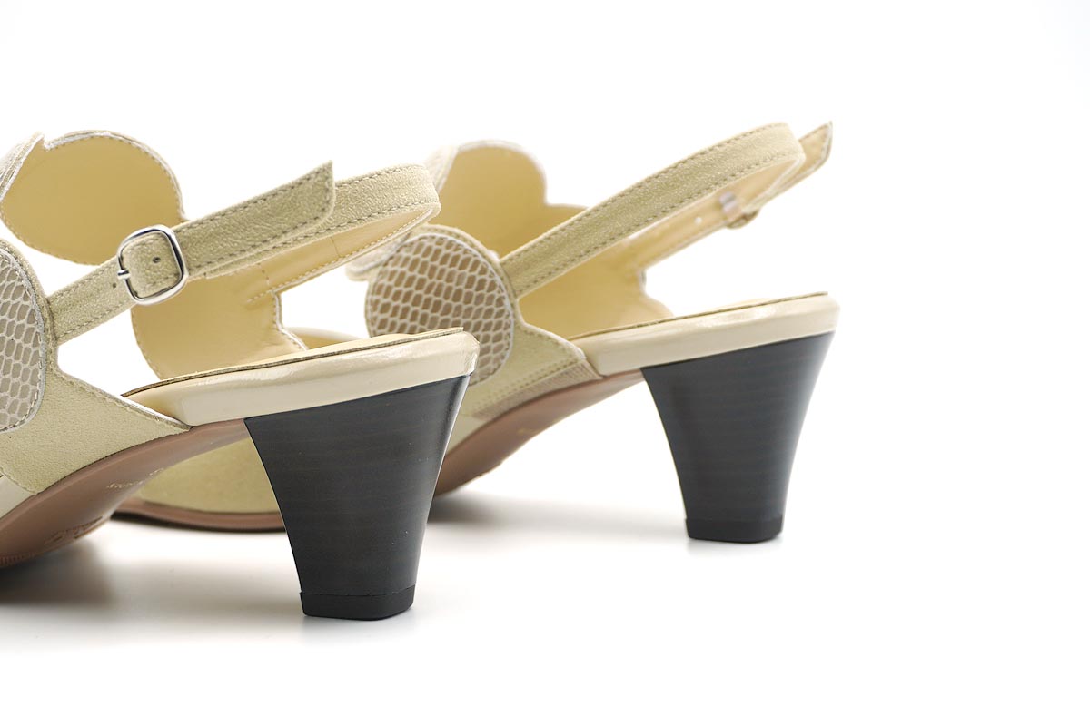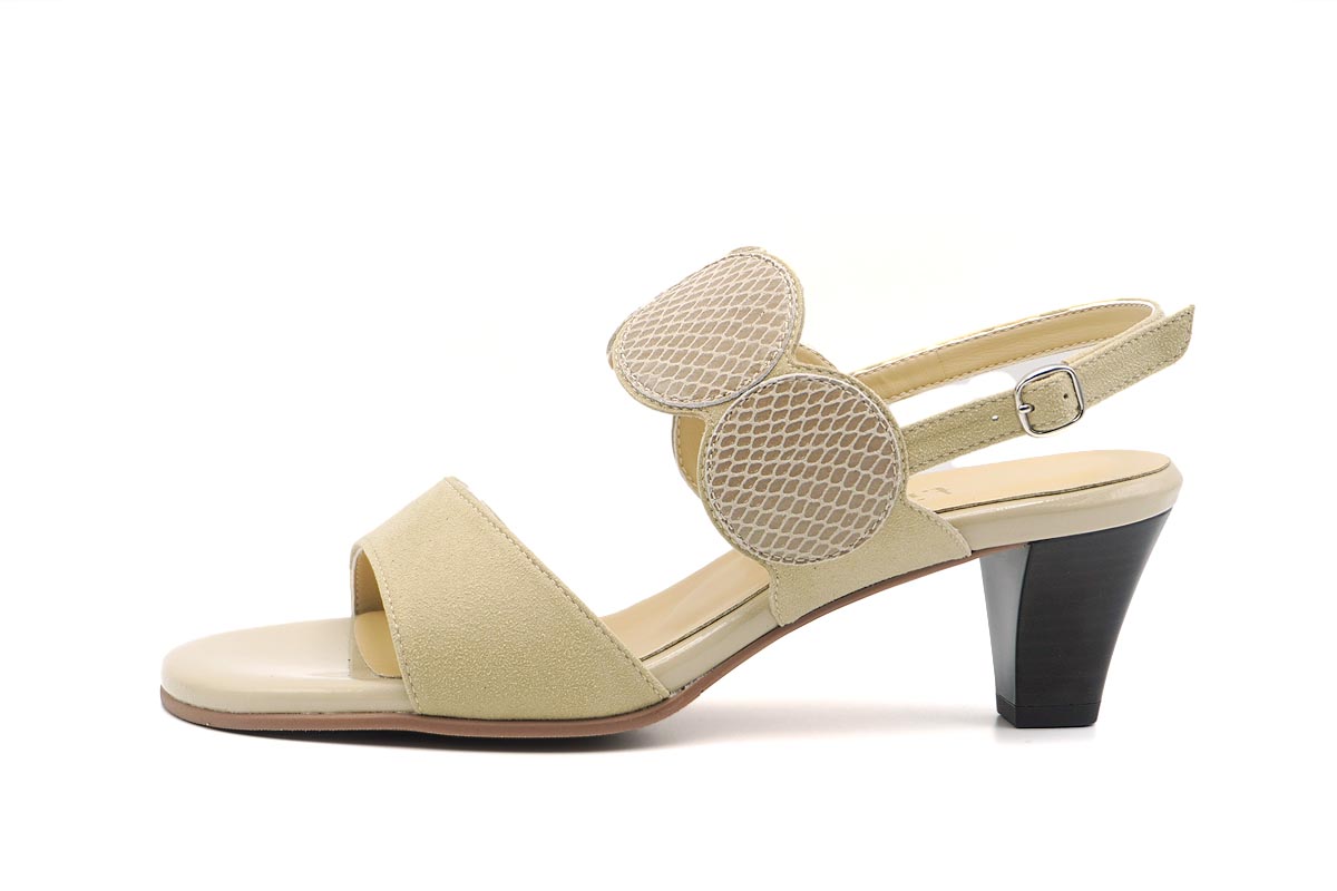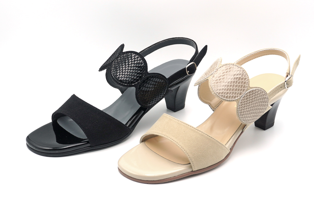 丸いモチーフを並べ、女性らしいアレンジが施された5.5㎝ヒールのエレガンスサンダルです。