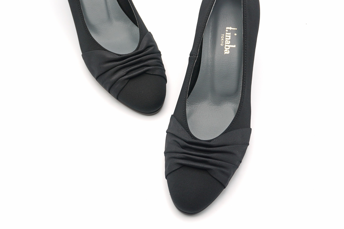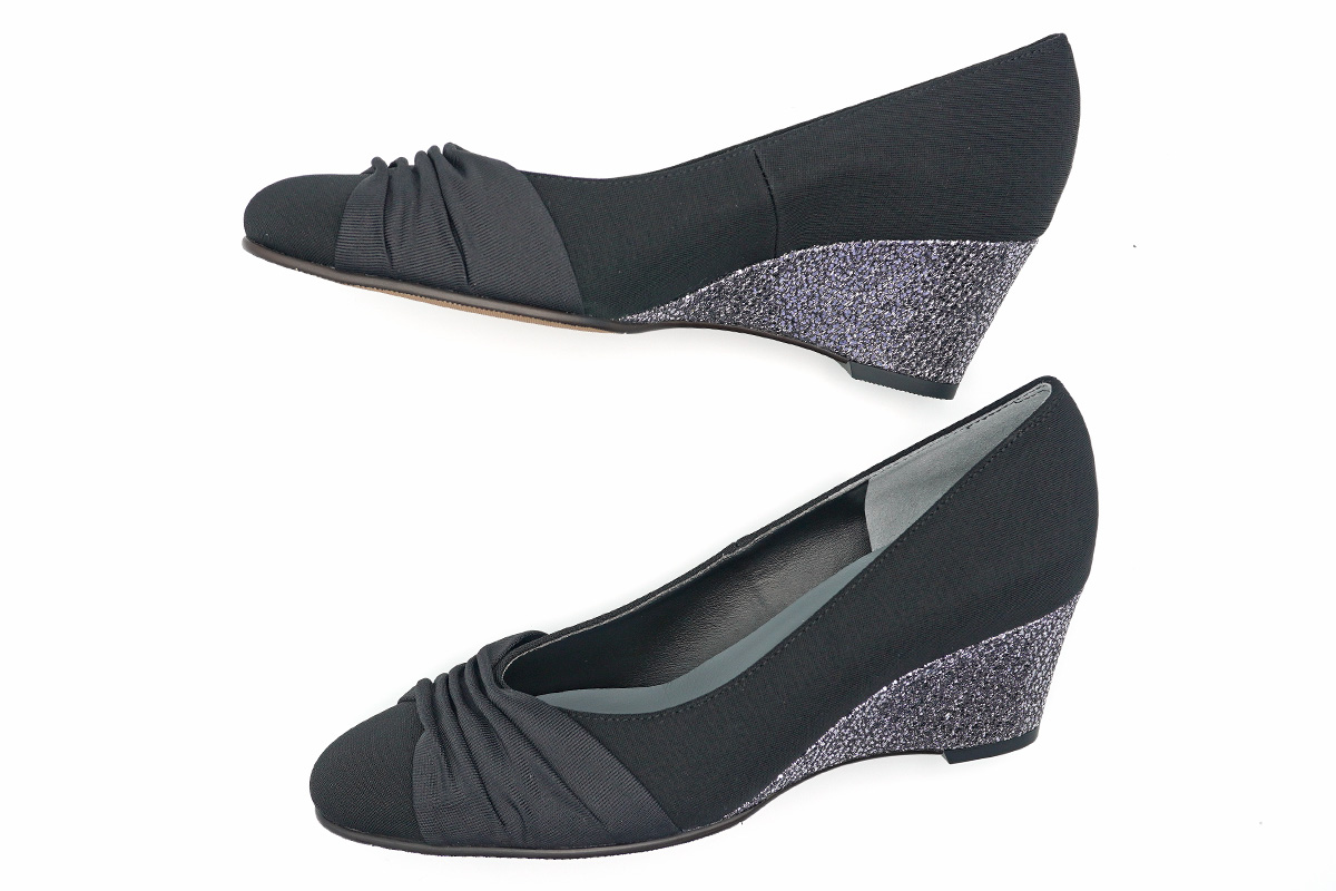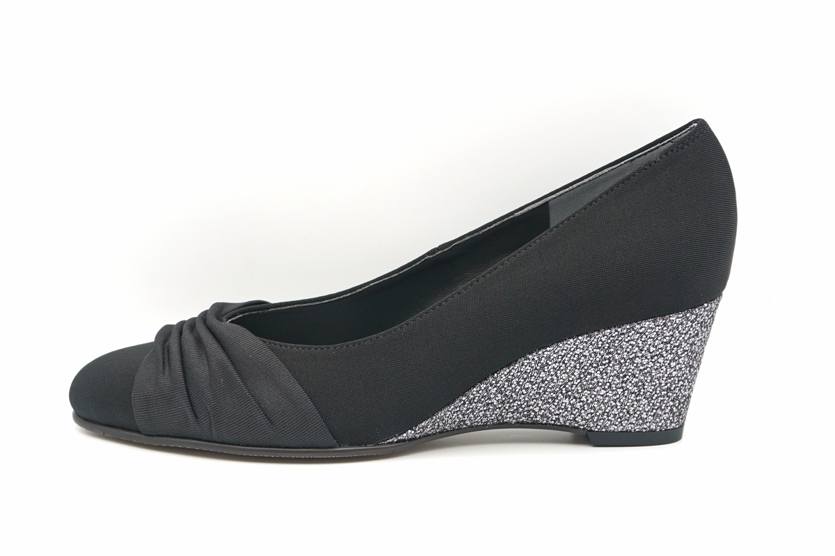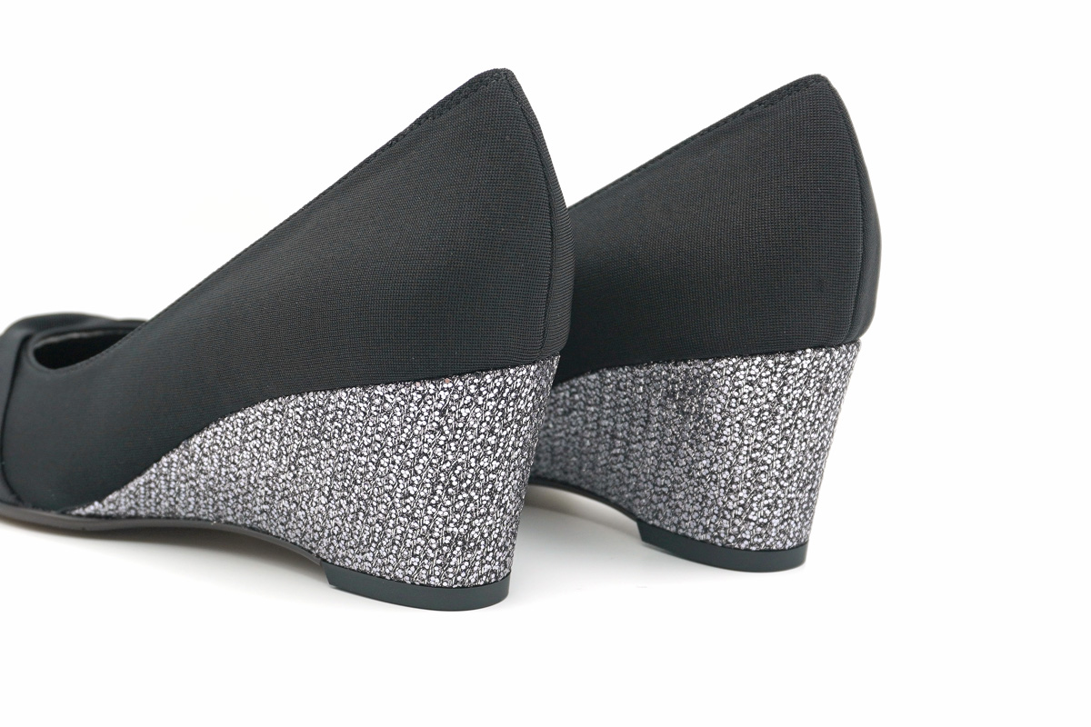 イナバ・オリジナルのストレッチを使用した、ウエッジヒールパンプス。