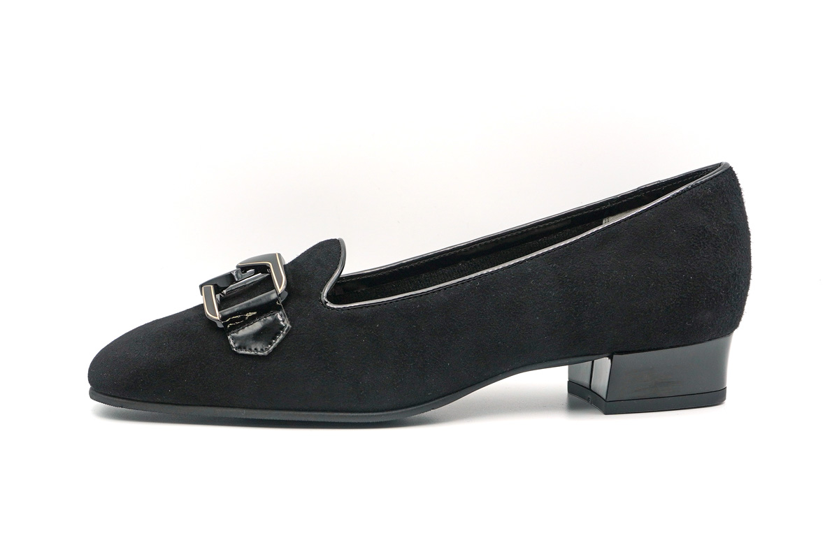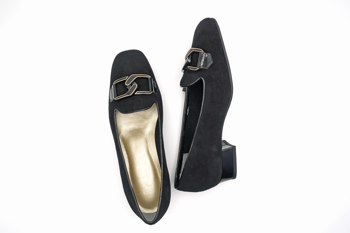 ゴールドのトリミングをあしらったバックルが華やぎを添えるオペラパンプスです。