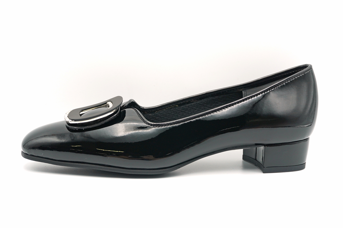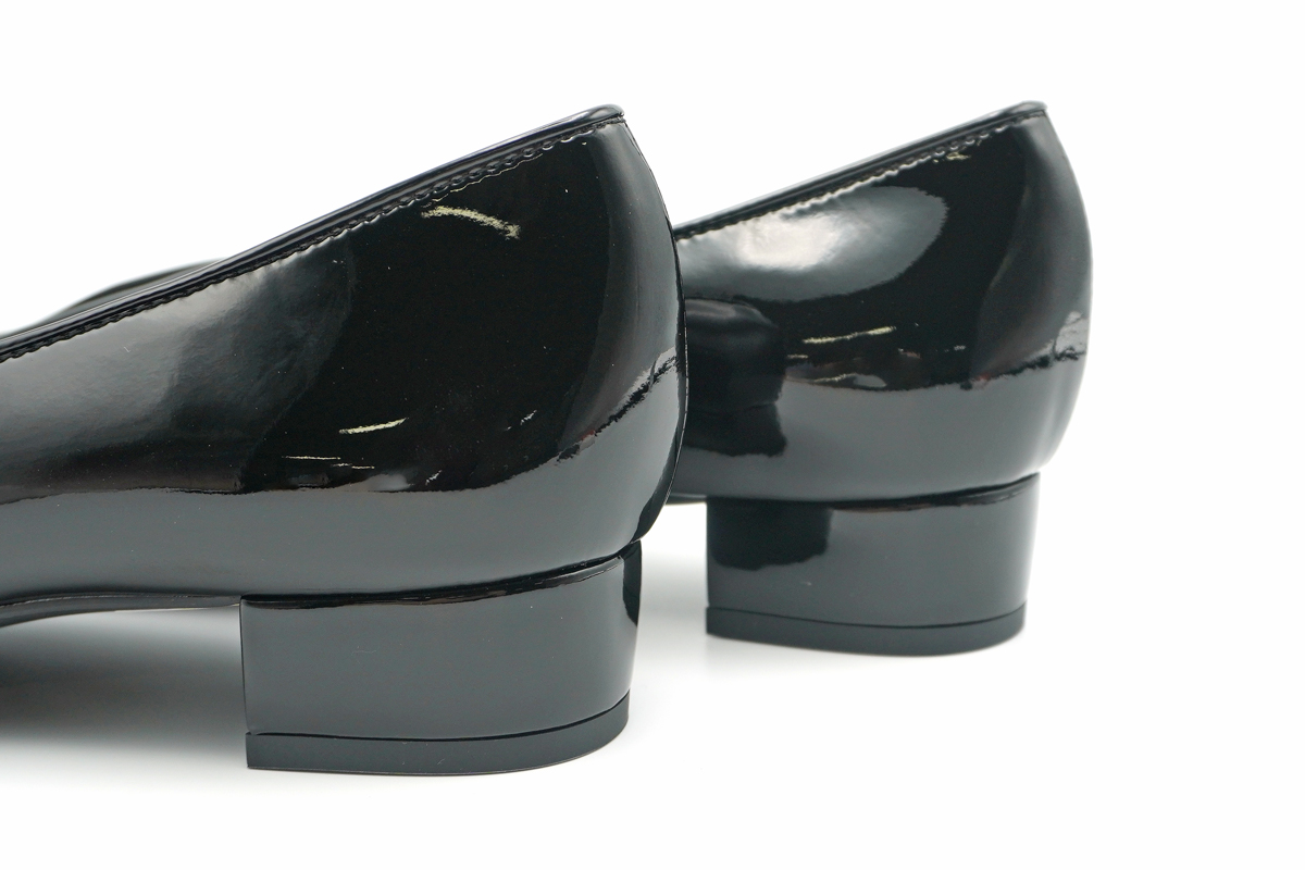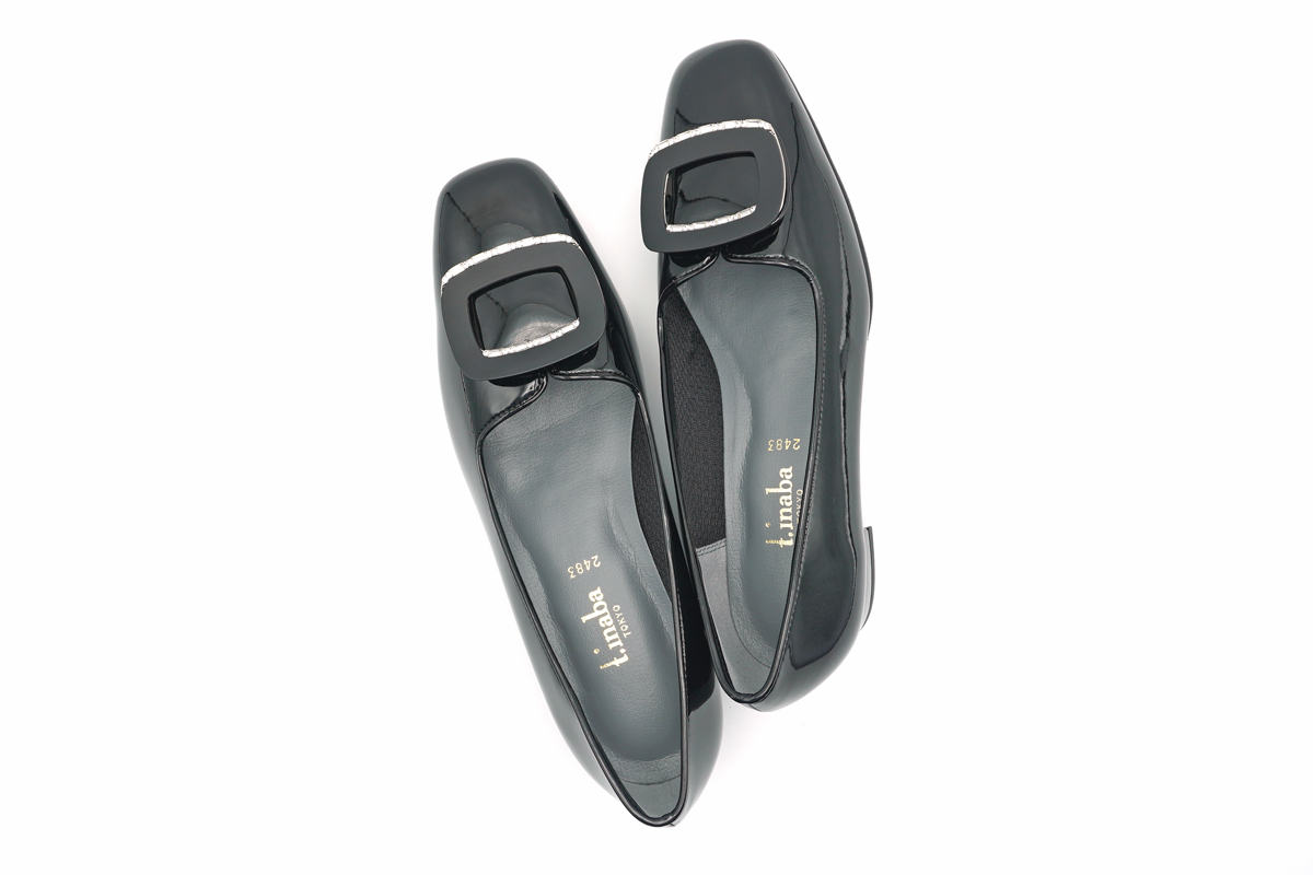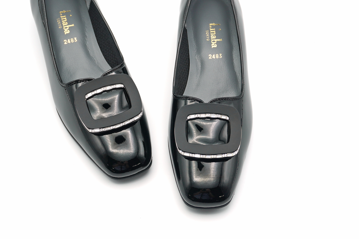 さりげなくに輝くラインストーン付きバックルをあしらった、エナメルパンプスです。