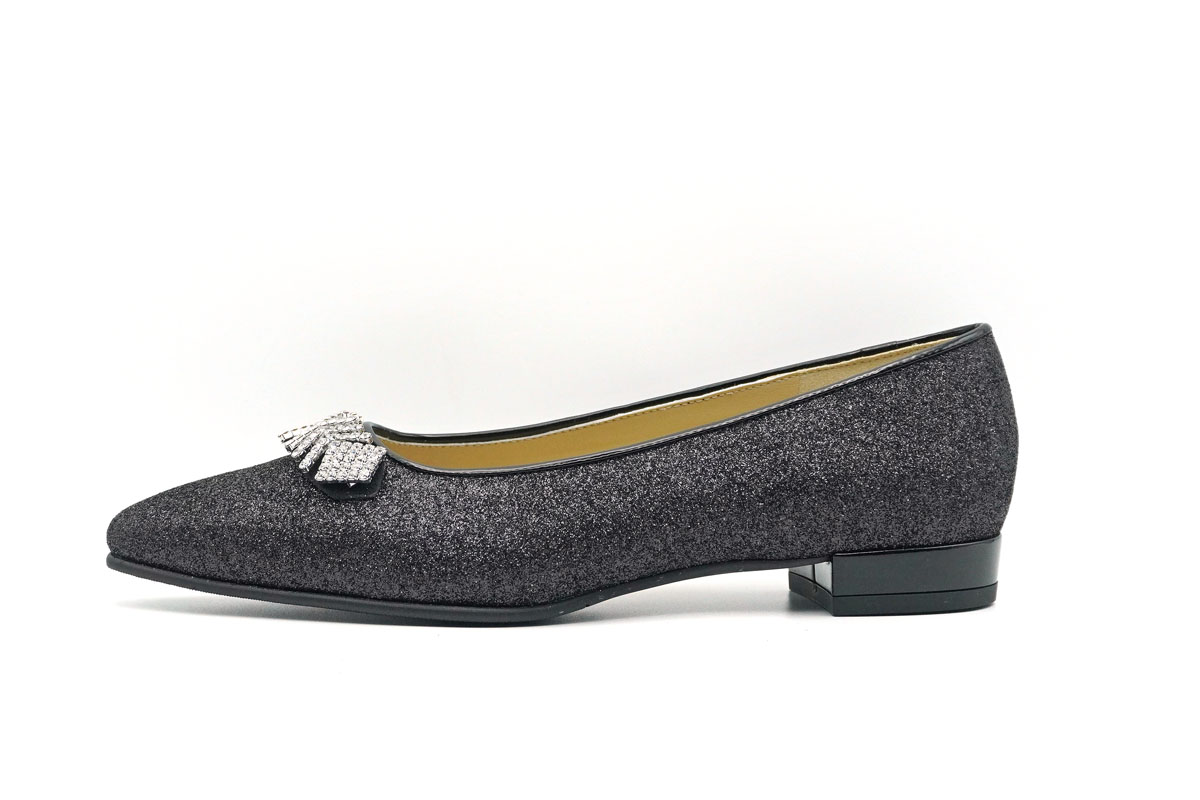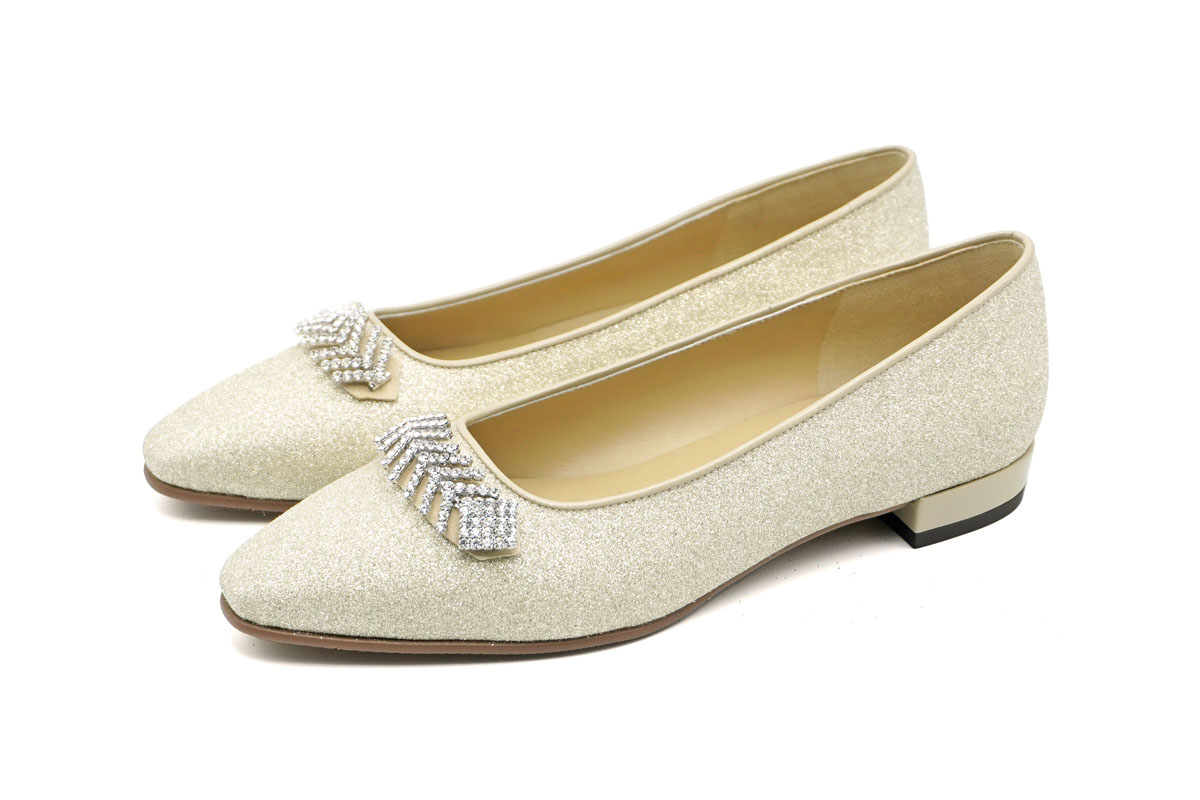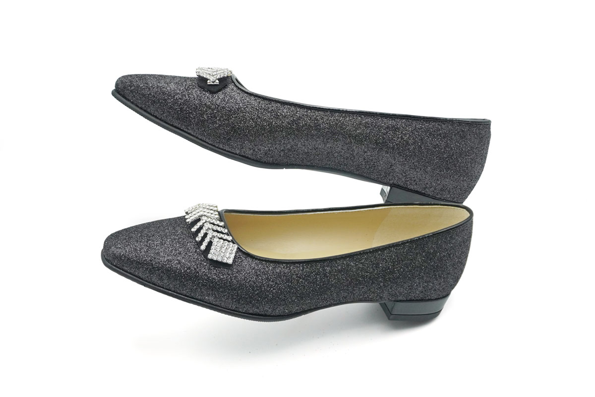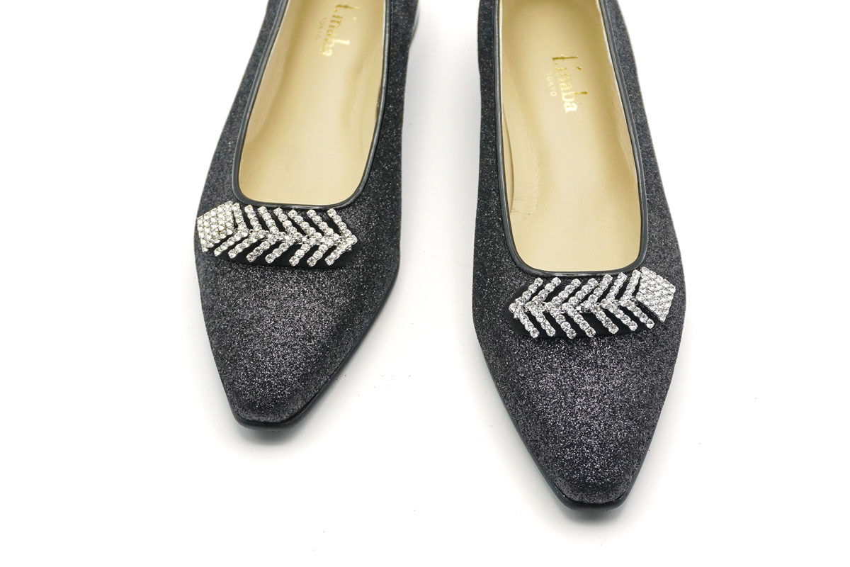 華やかな輝きに気分も上がるグリッター素材のビジュー付きパンプスです。