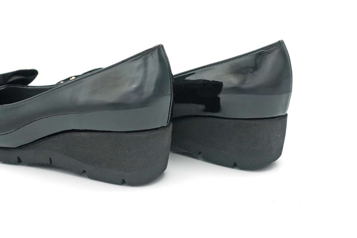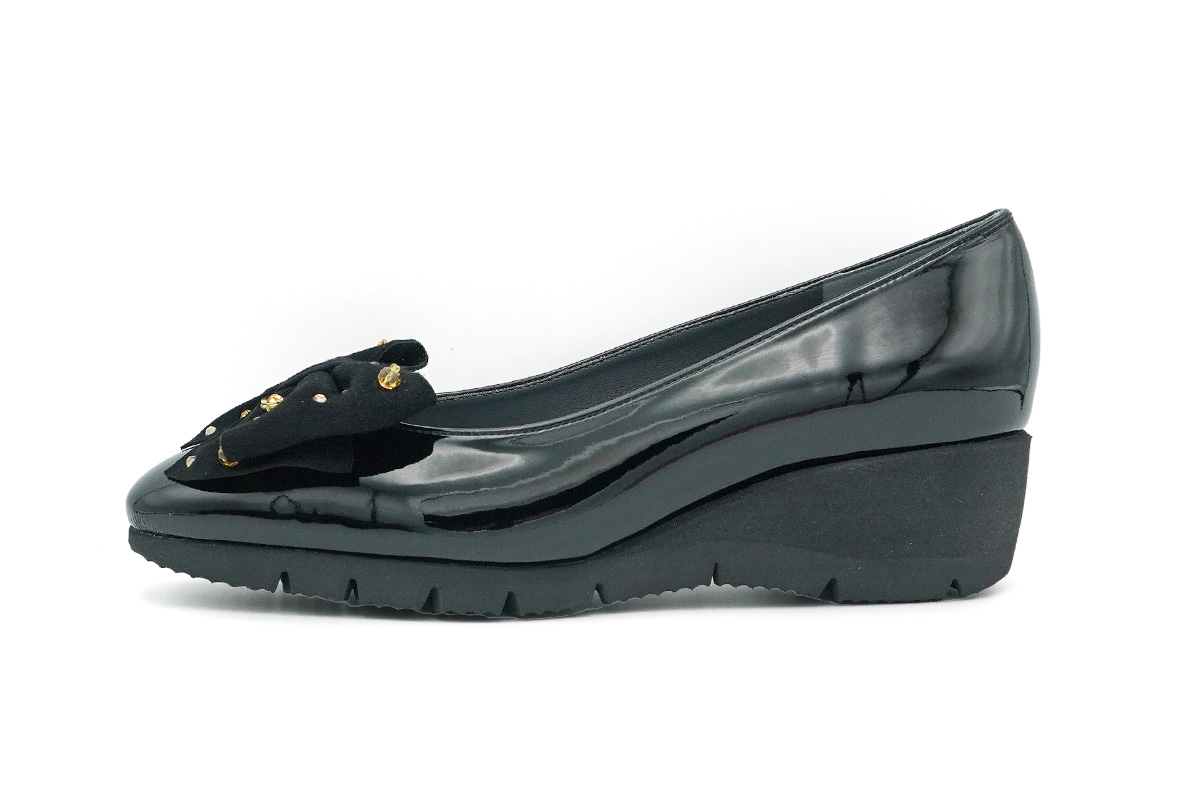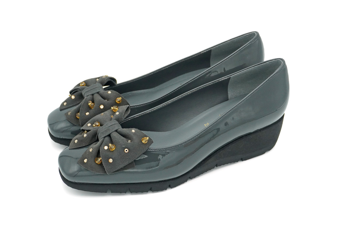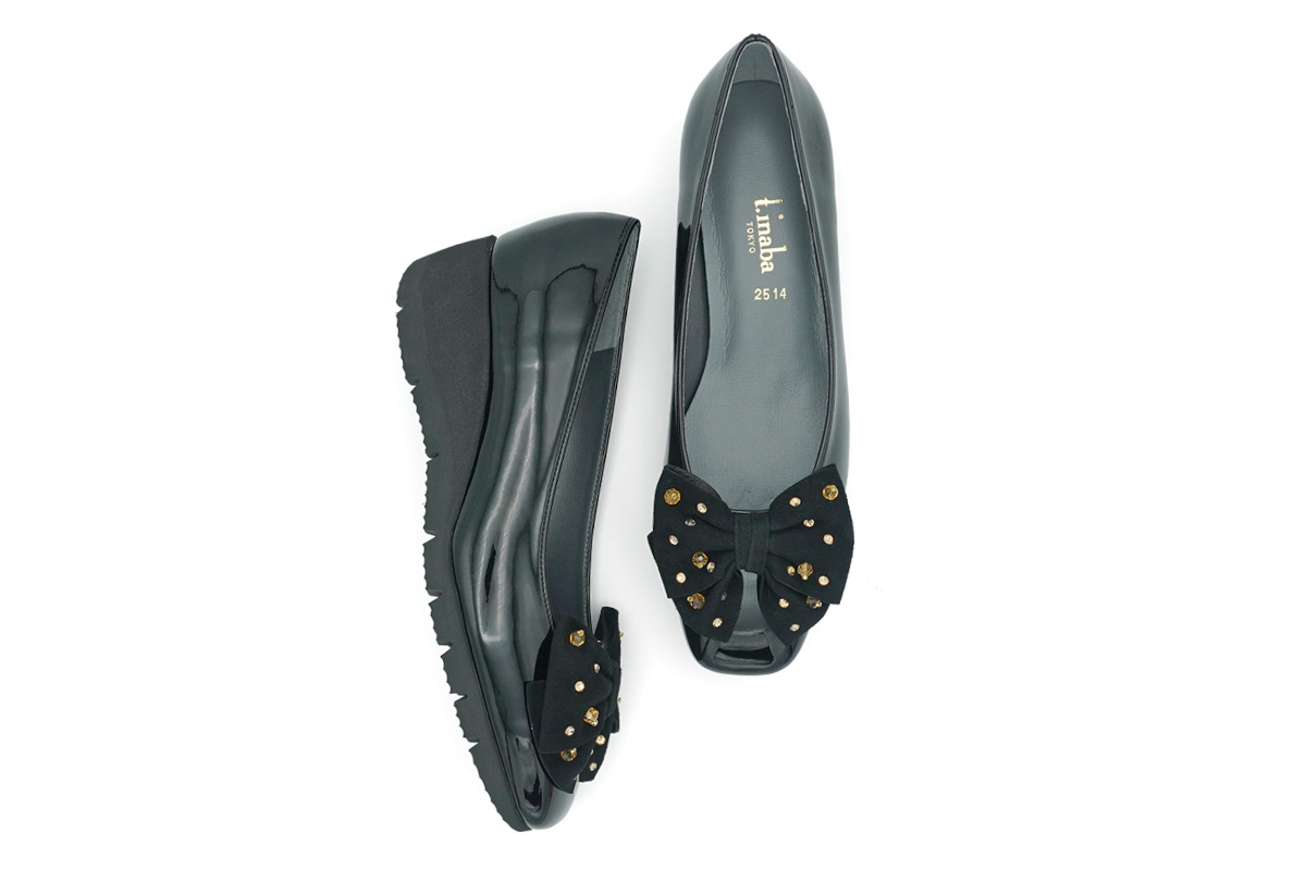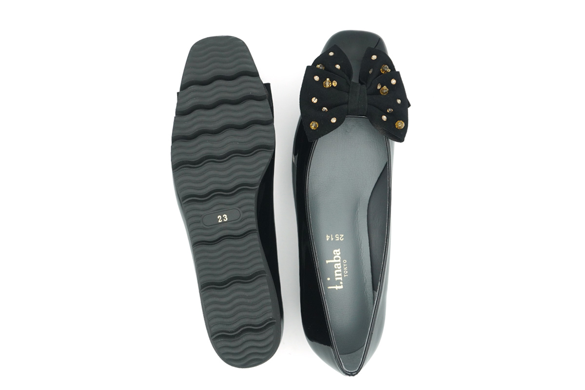 艶やかなエナメルに、華やかなビジュー付きリボンが引き立つ