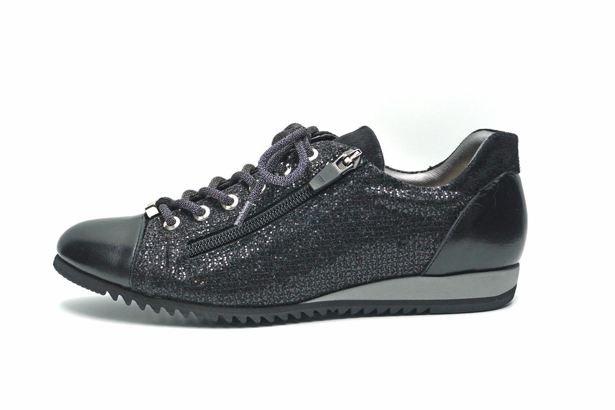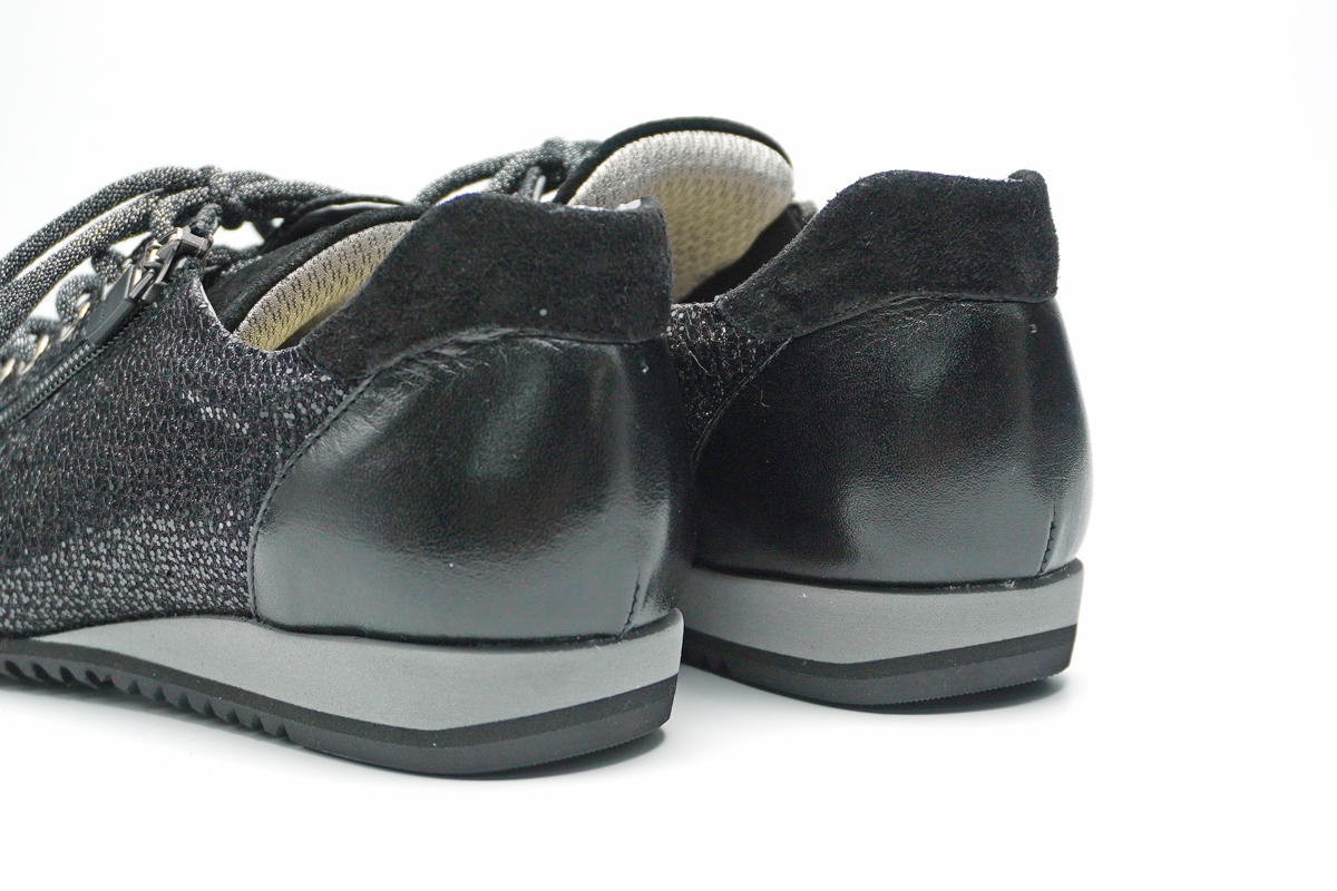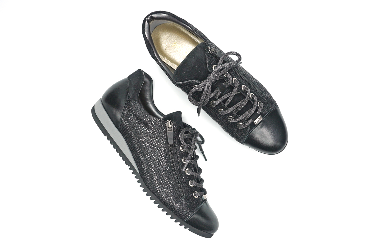 足に合わせて靴紐で調節でき、サイドのファスナーで脱ぎ履きも簡単です。