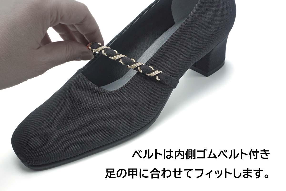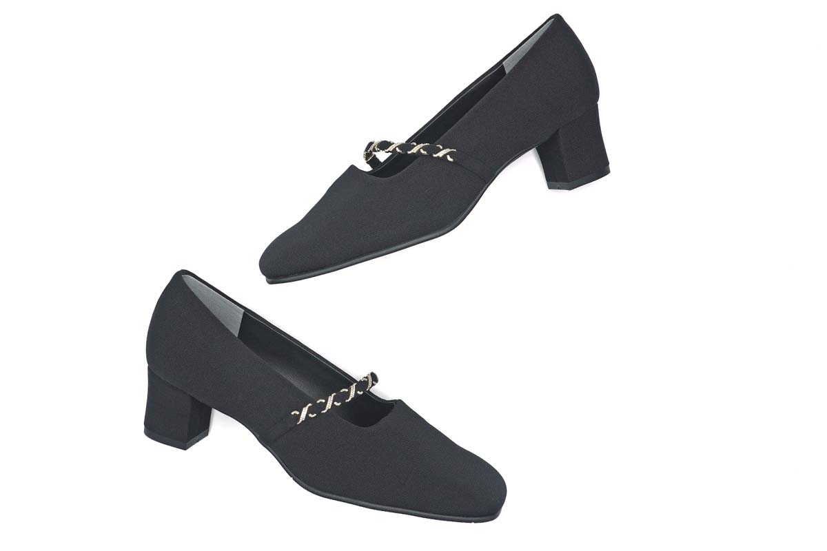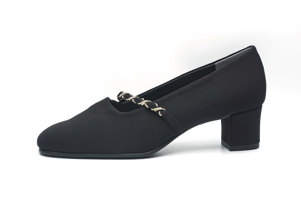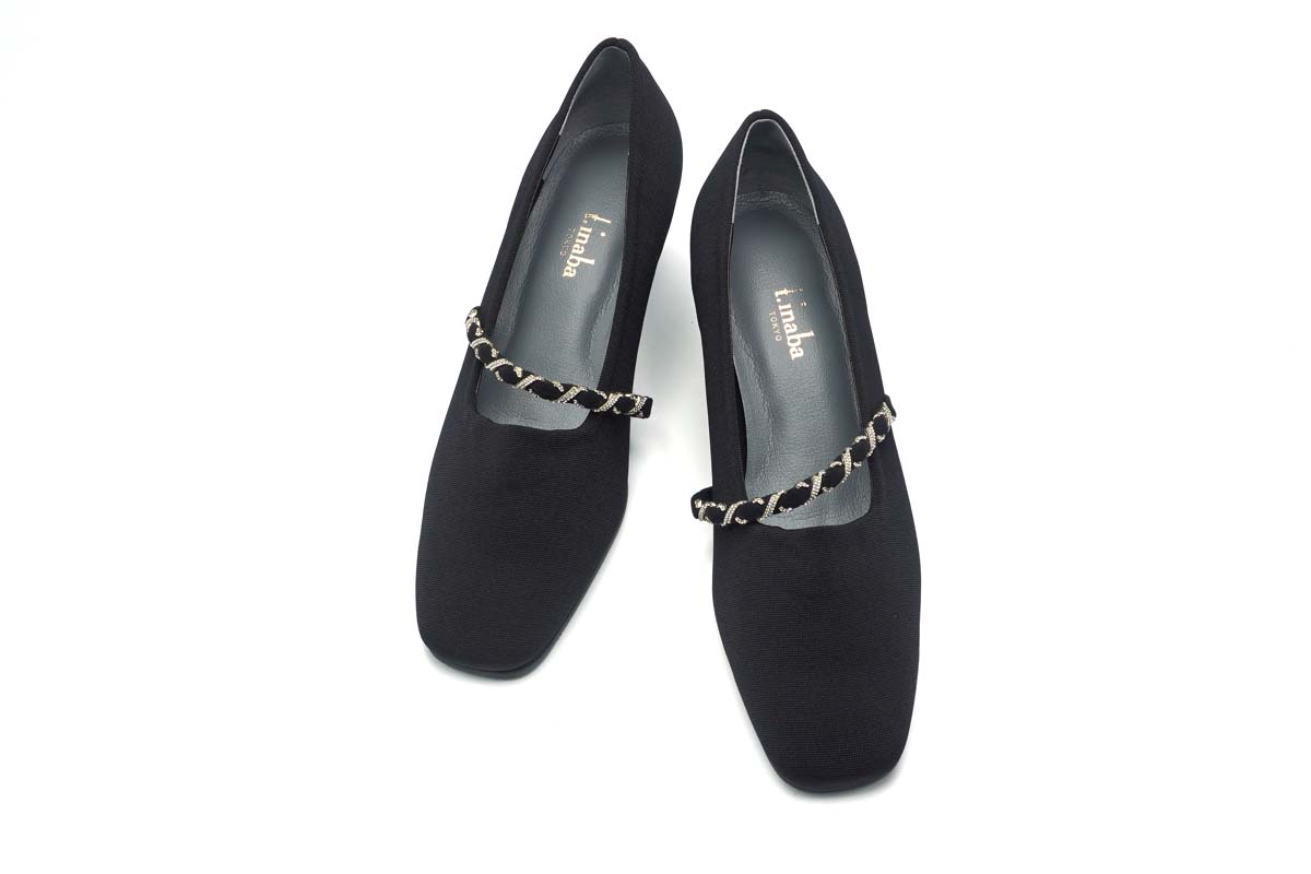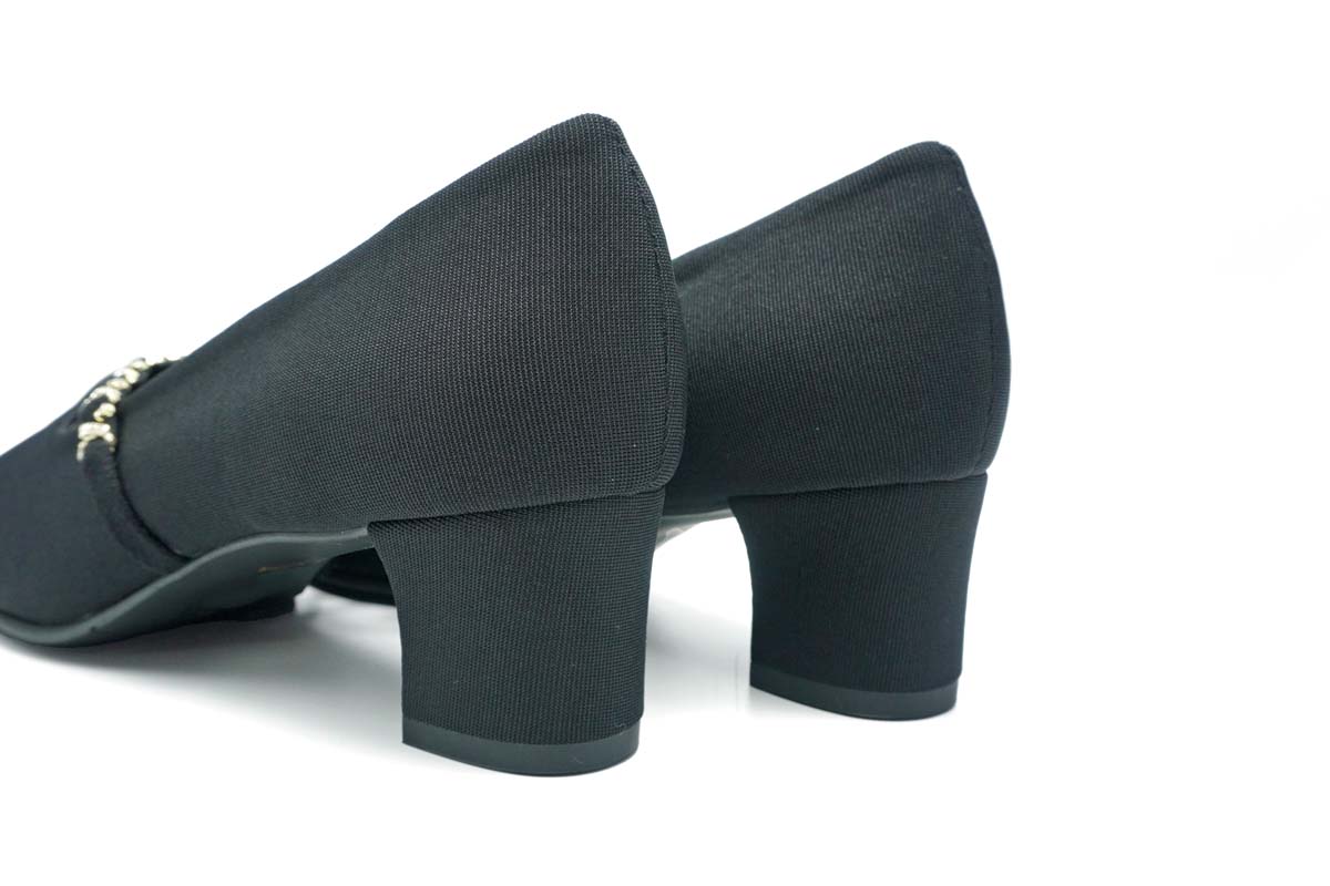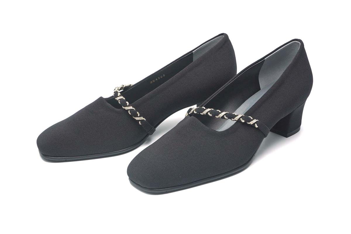 マットな質感のストレッチ素材に、メタリックチェーンをあしらったドレスシューズは、